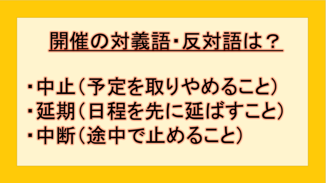ビジネス 開催の対義語・反対語(反対の言葉)・反意語・対照語は?例文も用いて徹底解説! yuki89829403 テクテク(TechTech)ライフ(旧:のほほんライフ) この記事では、「開催」の反対語・対義語について例文も交えて詳しく解説していきます。 反対語・対義語をマスターするには、語彙をどれだけ知 …