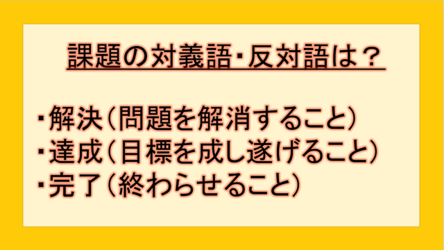 ビジネス 課題の対義語・反対語(反対の言葉)・反意語・対照語は?例文も用いて徹底解説! yuki89829403 テクテク(TechTech)ライフ(旧:のほほんライフ) この記事では、「課題」の反対語・対義語について例文も交えて詳しく解説していきます。 反対語・対義語をマスターするには、語彙をどれだけ知 …