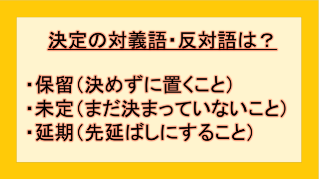 ビジネス 決定の対義語・反対語(反対の言葉)・反意語・対照語は?例文も用いて徹底解説! yuki89829403 テクテク(TechTech)ライフ(旧:のほほんライフ) この記事では、「決定」の反対語・対義語について例文も交えて詳しく解説していきます。 反対語・対義語をマスターするには、語彙をどれだけ知 …