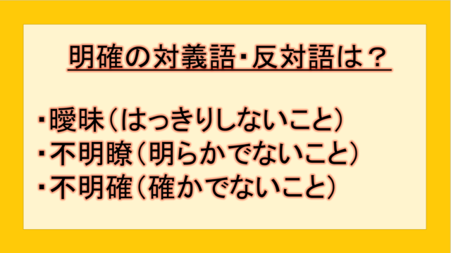 ビジネス 明確の対義語・反対語(反対の言葉)・反意語・対照語は?例文も用いて徹底解説! yuki89829403 テクテク(TechTech)ライフ(旧:のほほんライフ) この記事では、「明確」の反対語・対義語について例文も交えて詳しく解説していきます。 反対語・対義語をマスターするには、語彙をどれだけ知 …