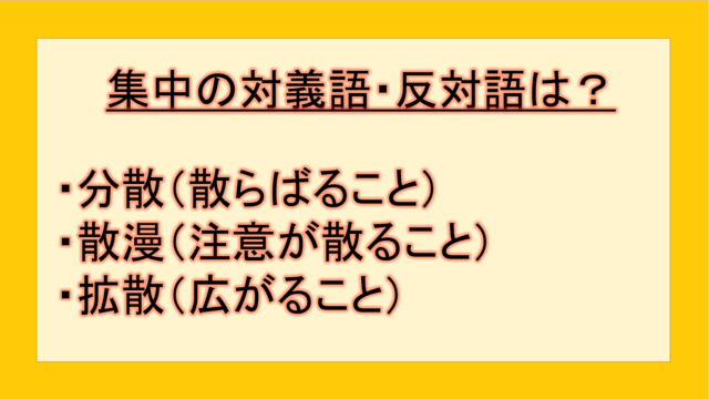 ビジネス 集中の対義語・反対語(反対の言葉)・反意語・対照語は?例文も用いて徹底解説! yuki89829403 テクテク(TechTech)ライフ(旧:のほほんライフ) この記事では、「集中」の反対語・対義語について例文も交えて詳しく解説していきます。 反対語・対義語をマスターするには、語彙をどれだけ知 …