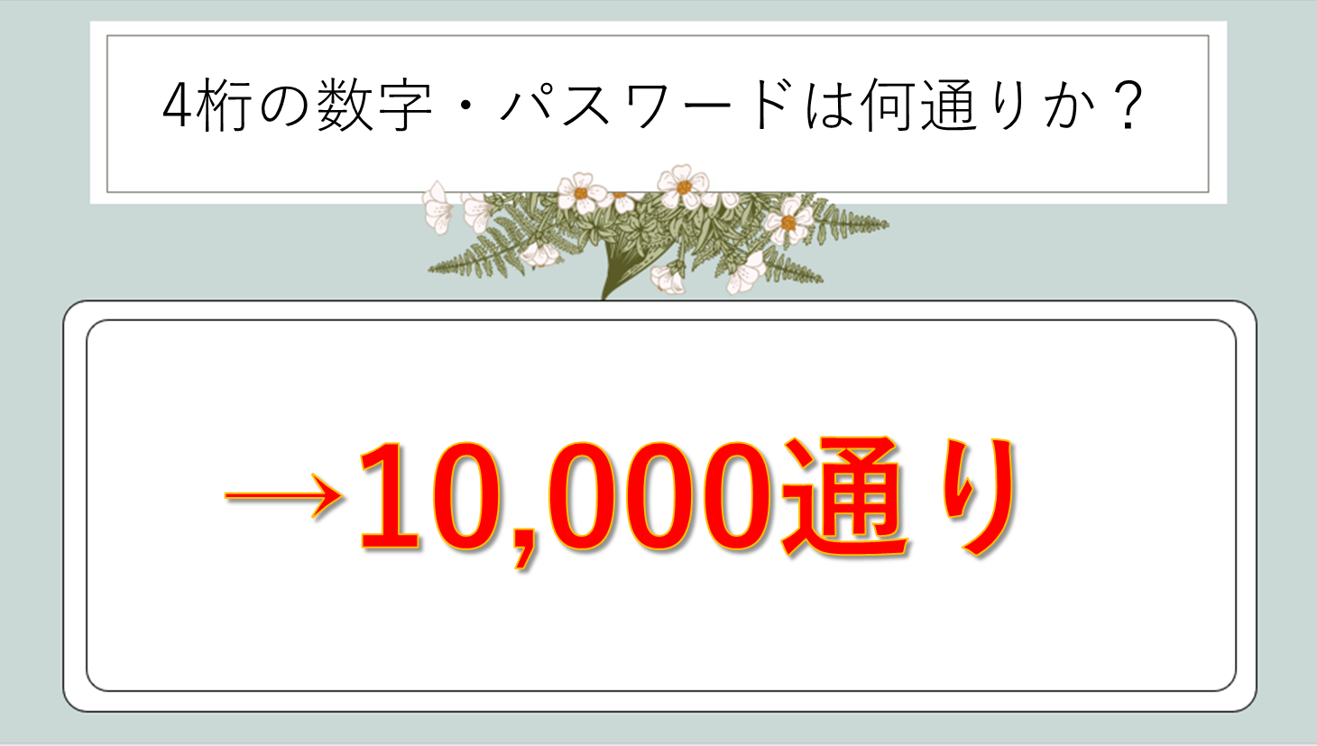 計算式:10 × 10 × 10 × 10 = 10⁴ = 10,000通り