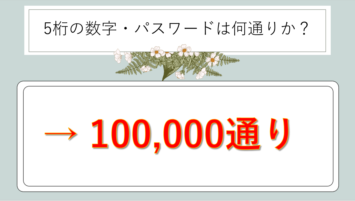 | 0~9 | あり | 100,000通り | 10⁵ |
