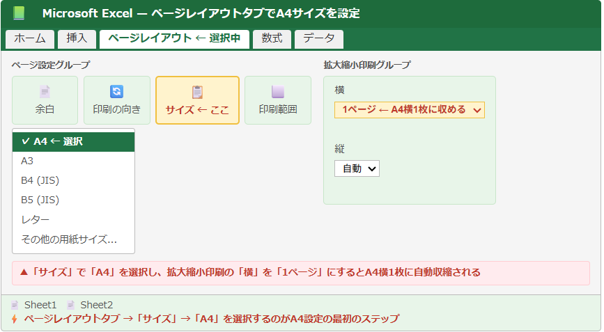 意図した通りA4で印刷するためには、作業開始前にシートの用紙サイズをA4に明示的に設定しておくことが重要です。
