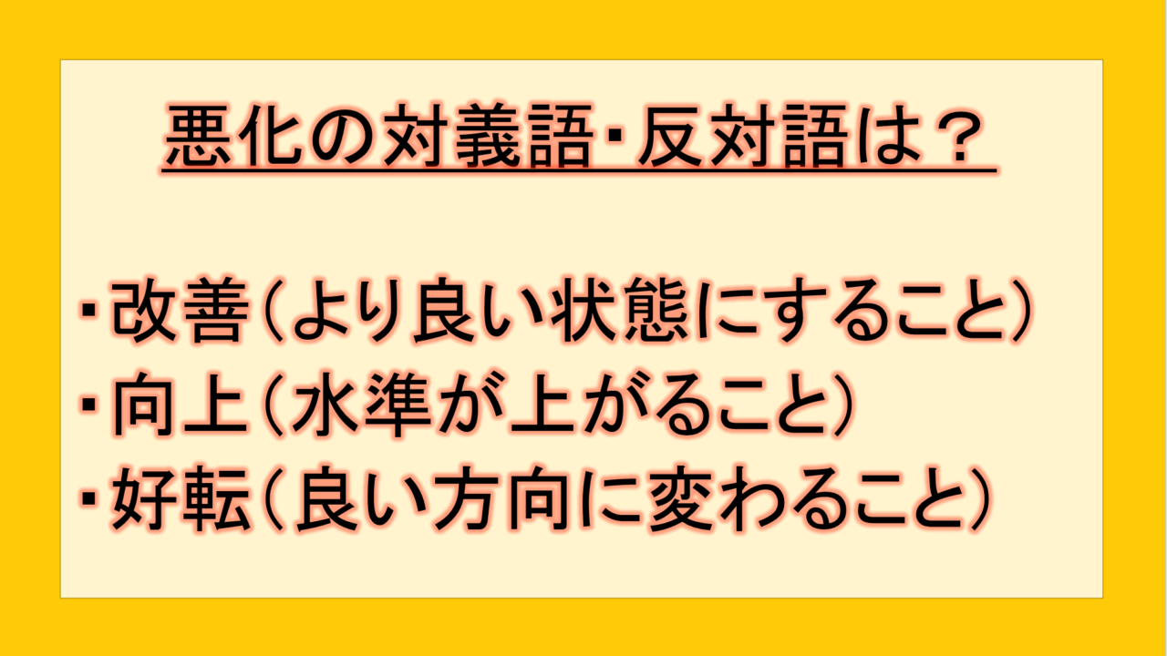 この記事では、「悪化」の反対語・対義語について例文も交えて詳しく解説していきます。