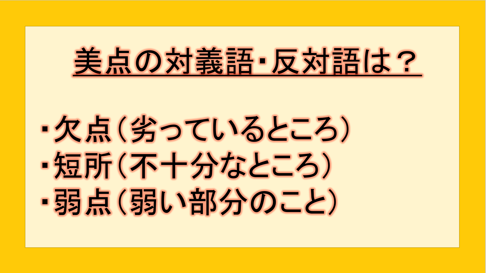 最初に「美点」の反対語・対義語を使った例文を紹介していきます!