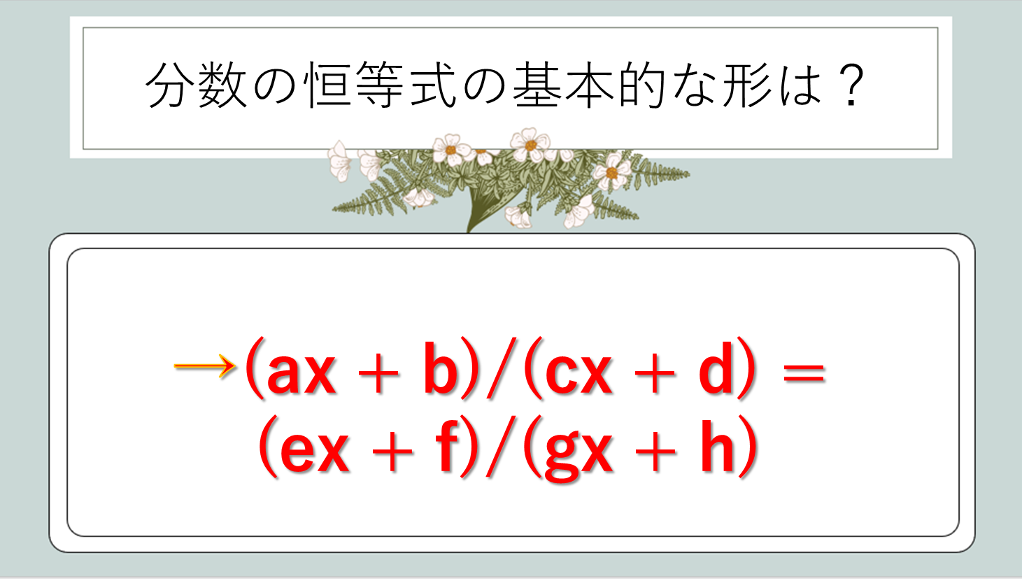 続いては、分数の恒等式の具体的な解法を確認していきます。