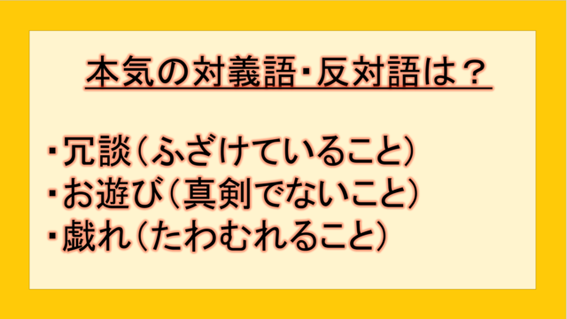 ビジネス 本気の対義語・反対語(反対の言葉)・反意語・対照語は?例文も用いて徹底解説! yuki89829403 テクテク(TechTech)ライフ(旧:のほほんライフ) この記事では、「本気」の反対語・対義語について例文も交えて詳しく解説していきます。 反対語・対義語をマスターするには、語彙をどれだけ知 …