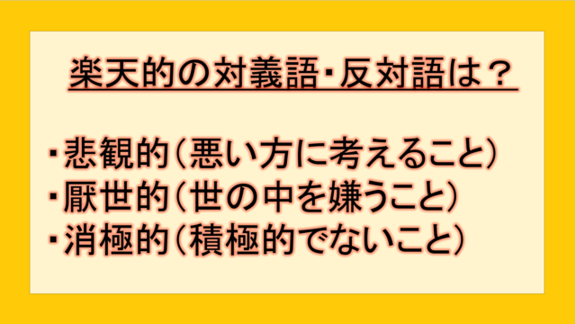 ビジネス 楽天的の対義語・反対語(反対の言葉)・反意語・対照語は?例文も用いて徹底解説! yuki89829403 テクテク(TechTech)ライフ(旧:のほほんライフ) この記事では、「楽天的」の反対語・対義語について例文も交えて詳しく解説していきます。 反対語・対義語をマスターするには、語彙をどれだけ …