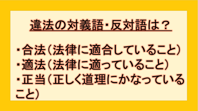 ビジネス 違法の対義語・反対語(反対の言葉)・反意語・対照語は?例文も用いて徹底解説! yuki89829403 テクテク(TechTech)ライフ(旧:のほほんライフ) この記事では、「違法」の反対語・対義語について例文も交えて詳しく解説していきます。 反対語・対義語をマスターするには、語彙をどれだけ知 …