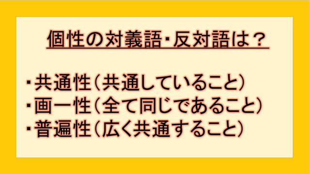 ビジネス 個性の対義語・反対語(反対の言葉)・反意語・対照語は?例文も用いて徹底解説! yuki89829403 テクテク(TechTech)ライフ(旧:のほほんライフ) この記事では、「個性」の反対語・対義語について例文も交えて詳しく解説していきます。 反対語・対義語をマスターするには、語彙をどれだけ知 …