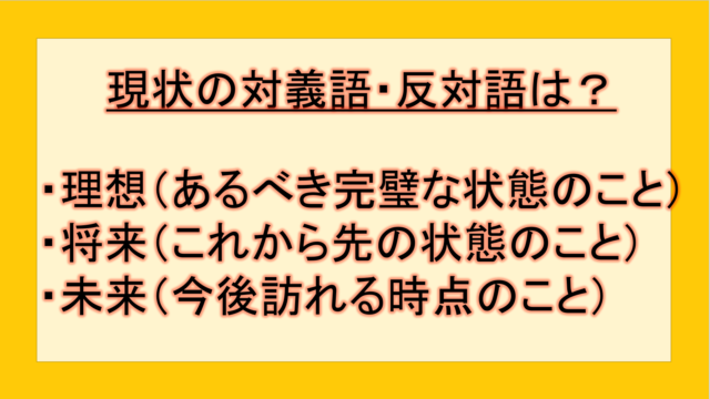 ビジネス 現状の対義語・反対語(反対の言葉)・反意語・対照語は?例文も用いて徹底解説! yuki89829403 テクテク(TechTech)ライフ(旧:のほほんライフ) この記事では、「現状」の反対語・対義語について例文も交えて詳しく解説していきます。 反対語・対義語をマスターするには、語彙をどれだけ知 …