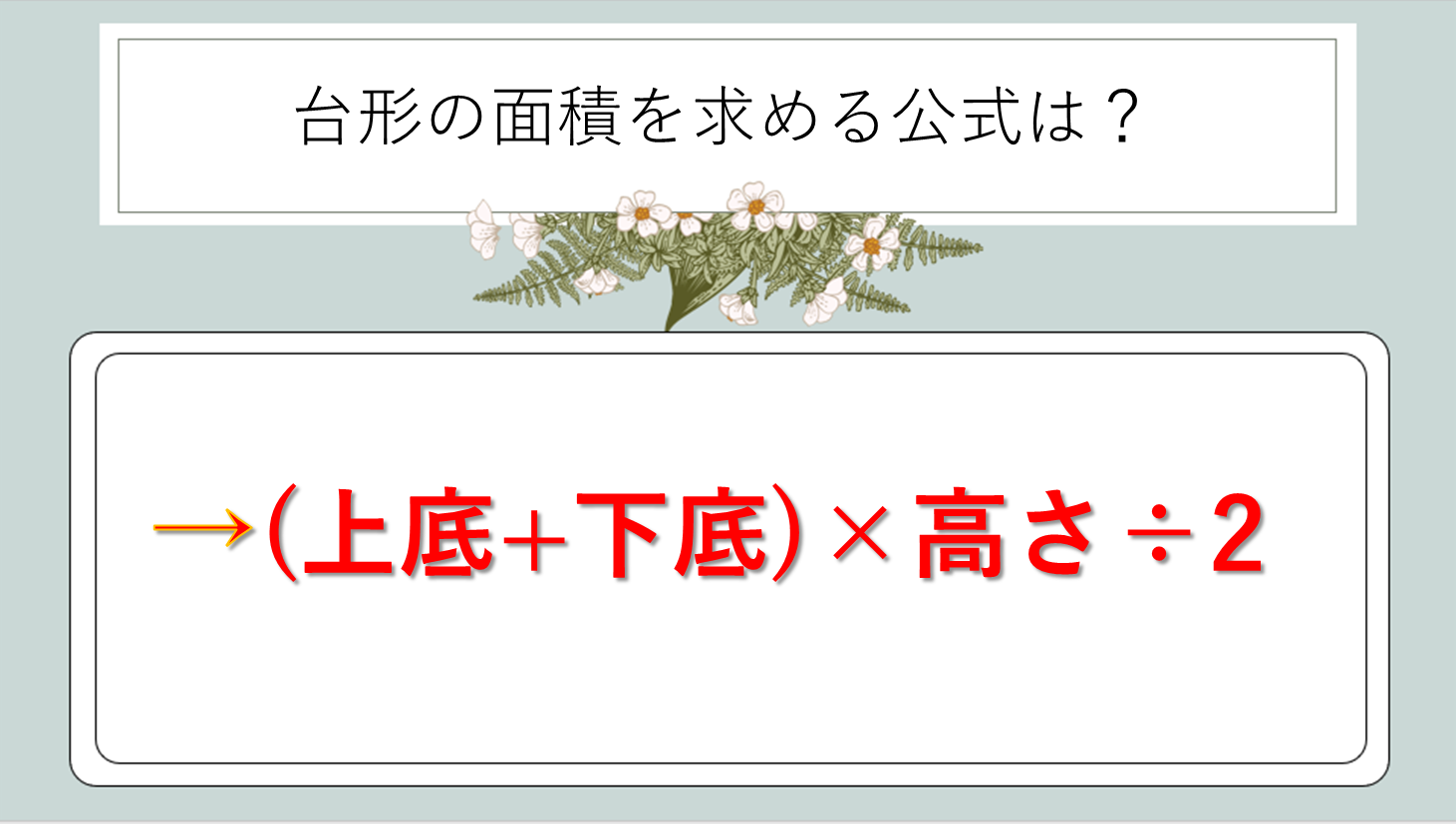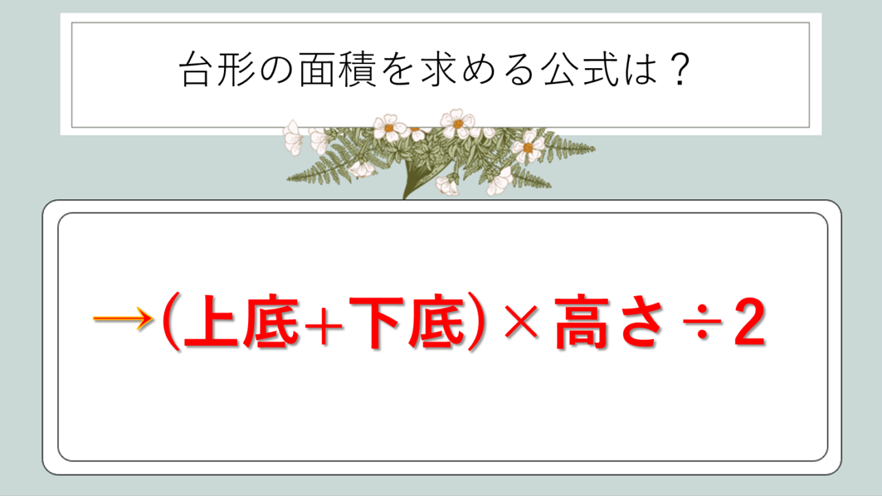 台形の面積を求める公式は、「(上底+下底)×高さ÷2」です。