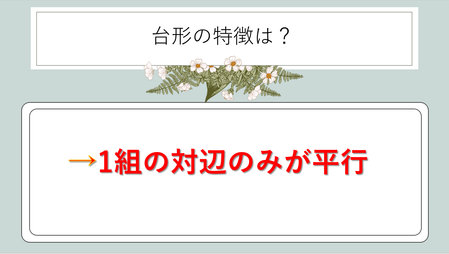 第二に、1組の対辺が平行であることが絶対条件となる。この条件を満たさなければ、それは台形ではなく、ただの四角形や不規則な四角形ということになります。