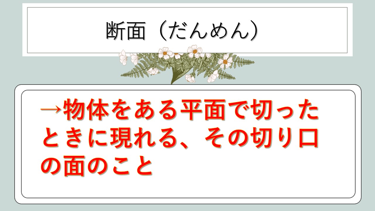 | 断面 | だんめん | 物体を切ったときの切り口の面 |