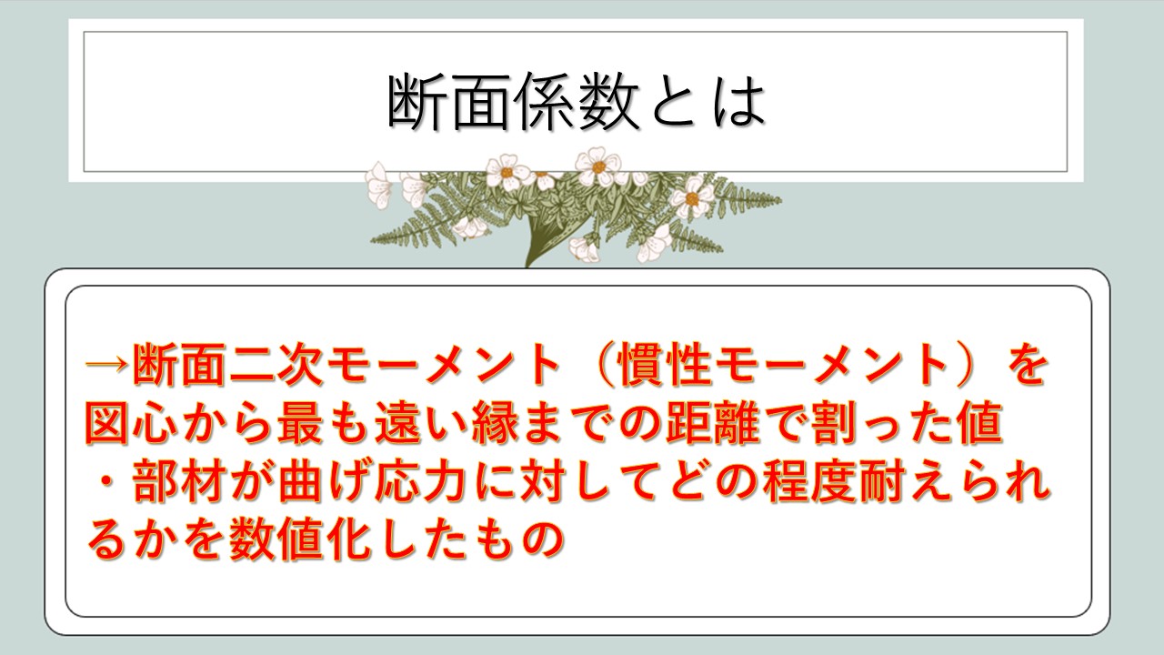 断面係数は「断面二次モーメント÷中立軸から最外縁までの距離」で定義され、部材の曲げ抵抗性能を表す値でしたね。この値が大きいほど、同じ曲げモーメントに対して発生する応力が小さくなり、構造的に有利になります。