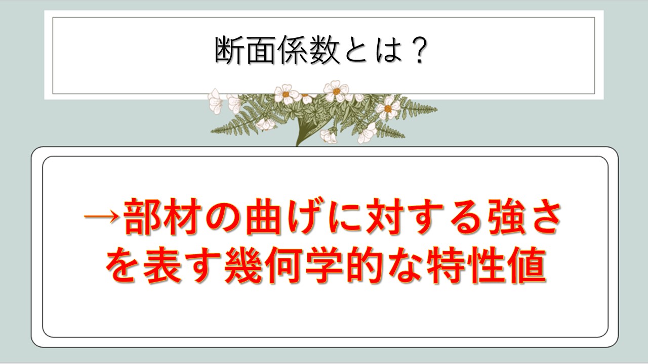断面係数とは、部材の曲げに対する強さを表す幾何学的な特性値のことを指します。