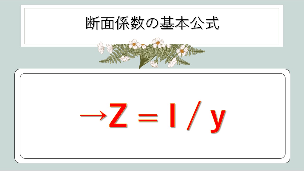 断面係数Zを求める基本公式は、断面二次モーメントIを中立軸からの距離yで割るという形で表されます。