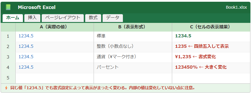 たとえば「1234.5」という数値のセルの書式を「整数」に変更すると、画面上は「1235」と表示されますが、内部には「1234.5」がそのまま保持されています。