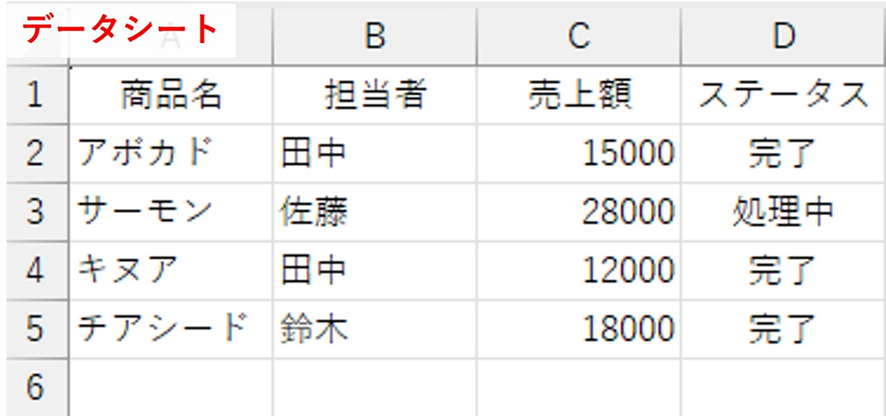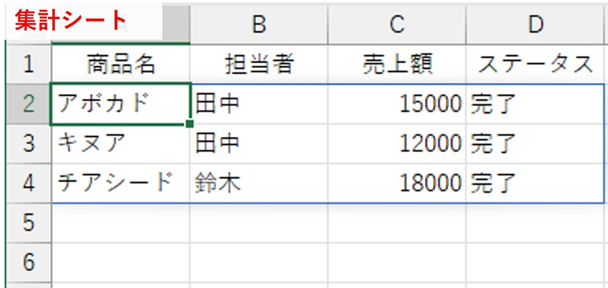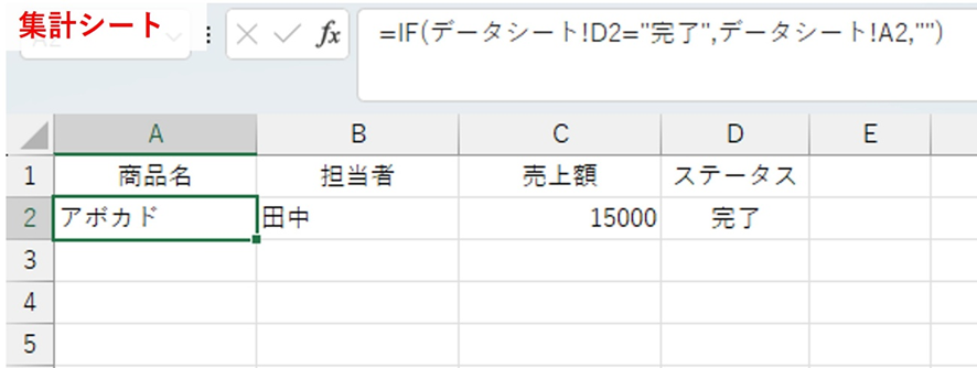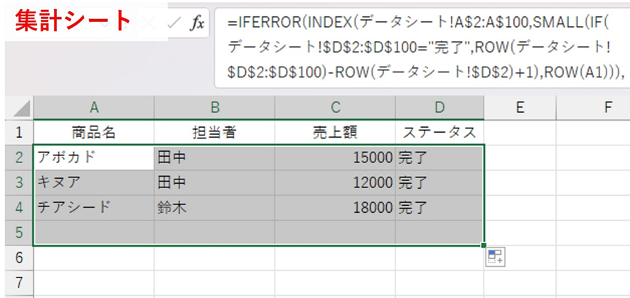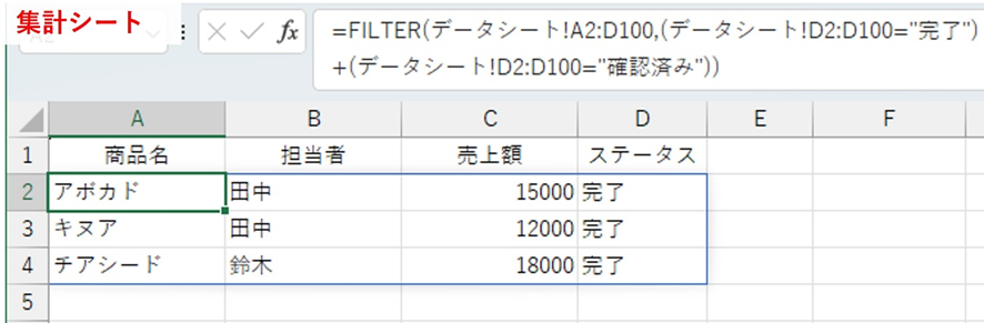 「データシート」にある売上データから、ステータスが「完了」のデータだけを「集計シート」に自動反映させたい場合に有効です。