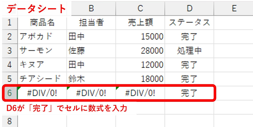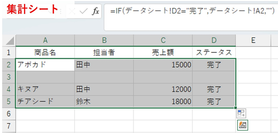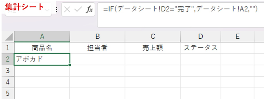 D2セル:=IF(データシート!D2=”完了”,データシート!D2,””)