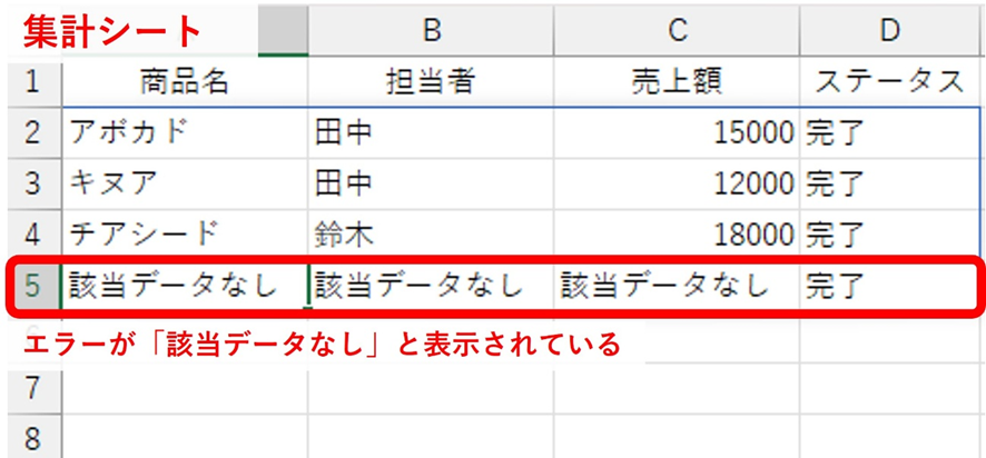 その後「データシート」でエラーとなる行を追加すれば、「集計シート」で「該当データなし」と表示されるか確認できます。