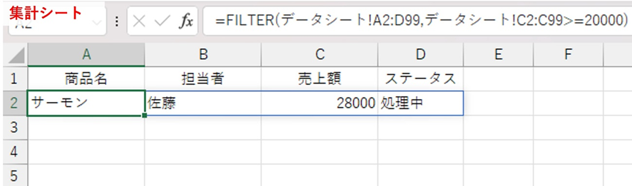 =FILTER(データシート!A2:D100,データシート!C2:C100>=20000)