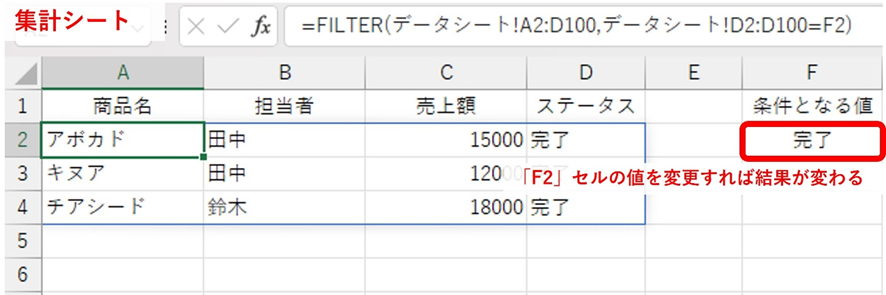 また、あらかじめセルに値を入力して、条件に紐付けることもできます。例えば「F2」セルに抽出したいステータスを入力しておけば、柔軟に条件を変更できます。