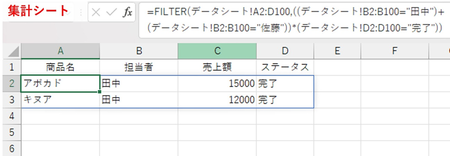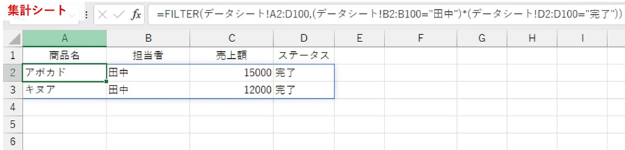 この数式は、担当者が「田中」かつステータスが「完了」の行だけを抽出します。両方の条件を満たす行のみが表示されるわけです。