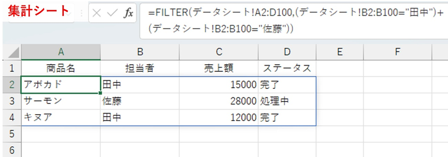 =FILTER(データシート!A2:D100,((データシート!B2:B100=”田中”)+(データシート!B2:B100=”佐藤”))*(データシート!D2:D100=”完了”))