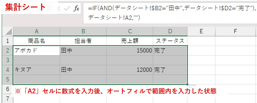 =IF(AND(データシート!$B2=”田中”,データシート!$D2=”完了”),データシート!A2,””)
