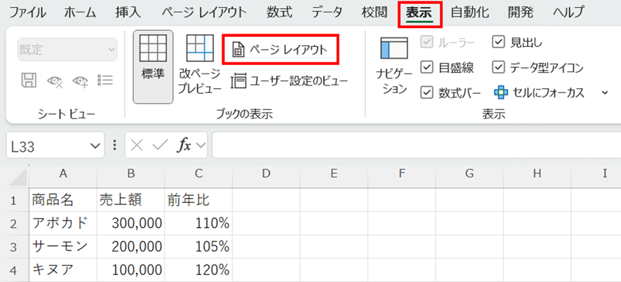 まず、「表示」タブをクリックして、「ページレイアウト」ビューを選択しましょう