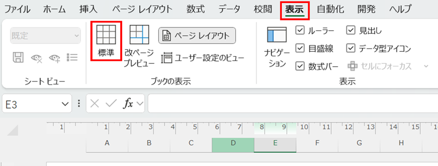 作業中に邪魔な場合は、「表示」タブから「標準」ビューに切り替えてください。