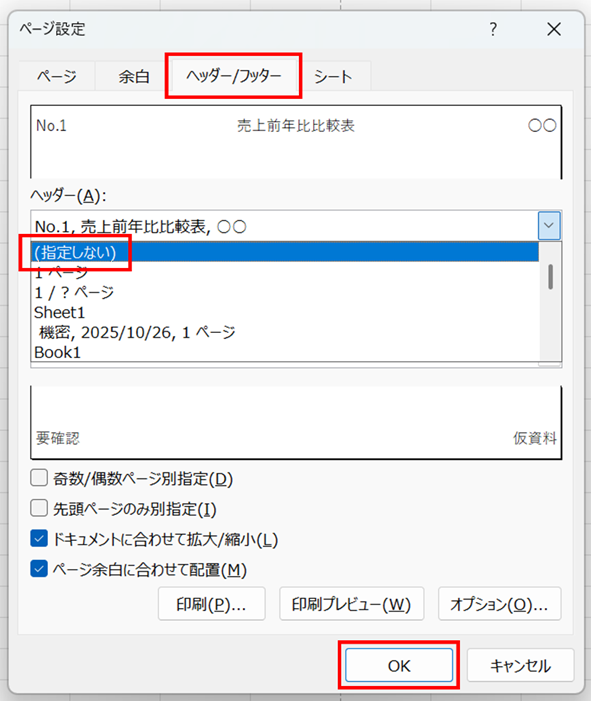 「ヘッダー/フッター」タブを選択し、「ヘッダー」と「フッター」のドロップダウンから「(指定しない)」を選択して「OK」をクリックすれば、ヘッダーとフッターが削除されます。