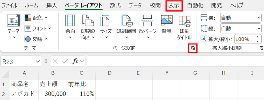 「ページレイアウト」タブの「ページ設定」グループにある小さな矢印をクリックして、ページ設定ダイアログを開きましょう。