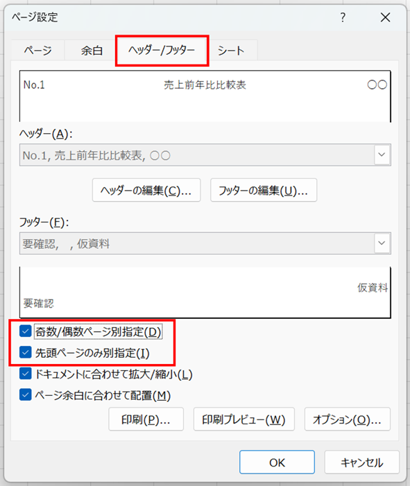 エクセルで先頭ページや奇数偶数ページのヘッダー・フッターを削除する方法2【特殊設定の解除】