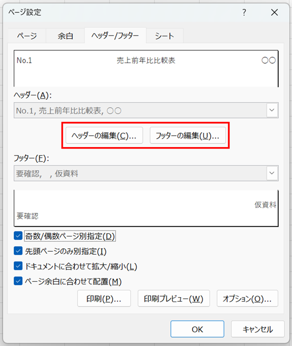 「先頭ページのみ別指定」にチェックが入っている場合は、「ヘッダーの編集」または「フッターの編集」ボタンをクリックして、先頭ページ用のヘッダー・フッターを確認してください。
