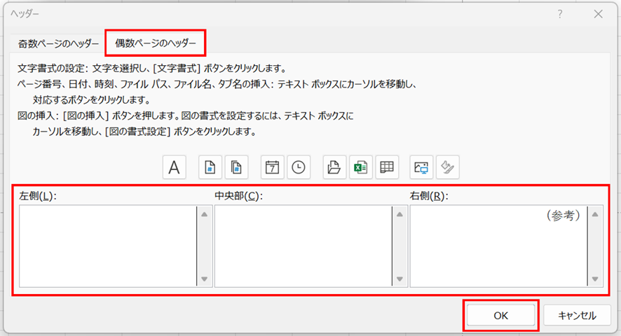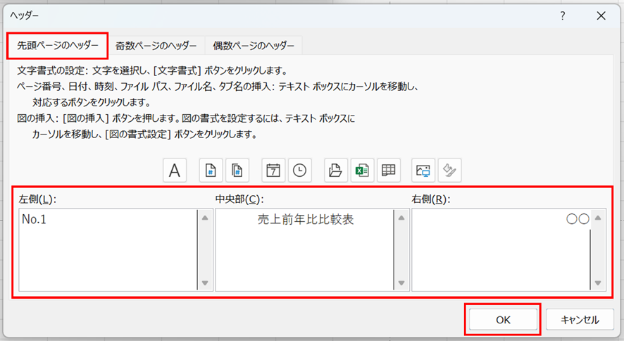 ヘッダー・フッター編集ダイアログが開いたら、上部に「先頭ページのヘッダー」と表示されます。ここで3つのセクション全てを空にして「OK」をクリックしましょう。