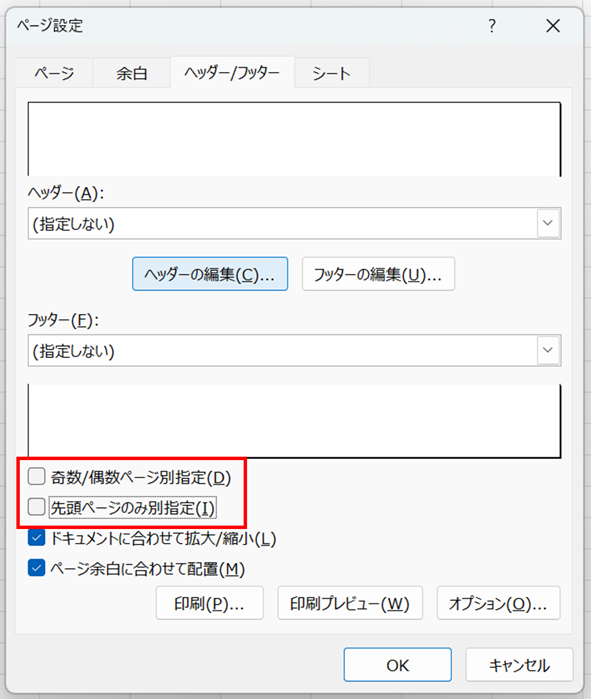 「ヘッダー/フッター」タブを選択し、下部にある「先頭ページのみ別指定」と「奇数/偶数ページ別指定」のチェックボックスを確認してください。