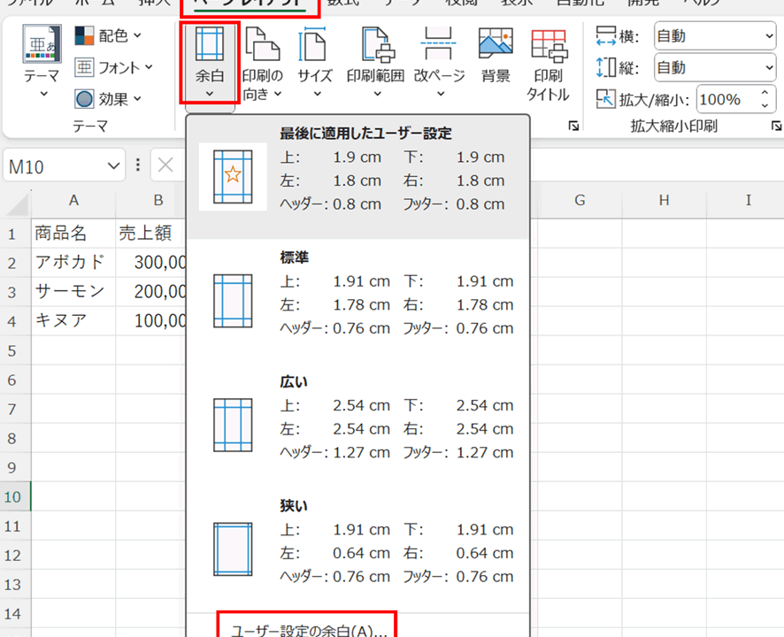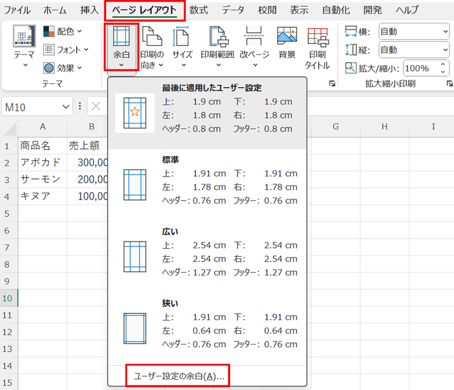 「ページレイアウト」タブの「余白」ボタンから「ユーザー設定の余白」を選択します。