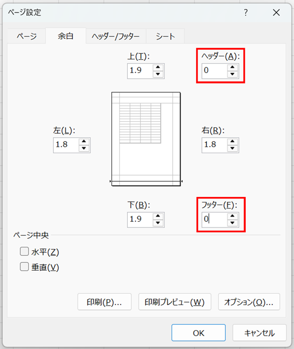 ページ設定ダイアログの「余白」タブで「ヘッダー」と「フッター」の数値を「0」に設定すると、ヘッダー・フッター領域のスペースも最小化されます。