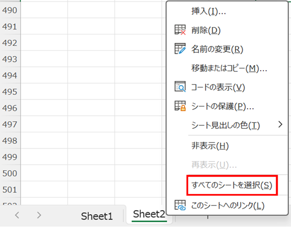 複数シートがある場合は、シートごとにヘッダー・フッターが設定されている可能性があります。全てのシートで同じ操作を行う必要があるため、シートタブを右クリックして「すべてのシートを選択」してからヘッダー・フッターを削除すると効率的でしょう。