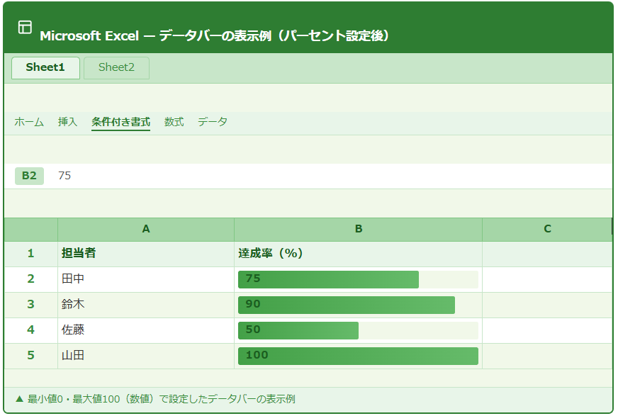 ▲ パーセント書式(0.75→75%表示)のセルにデータバーを適用。最大値を「数値:1」に設定することで正しく表示されます。