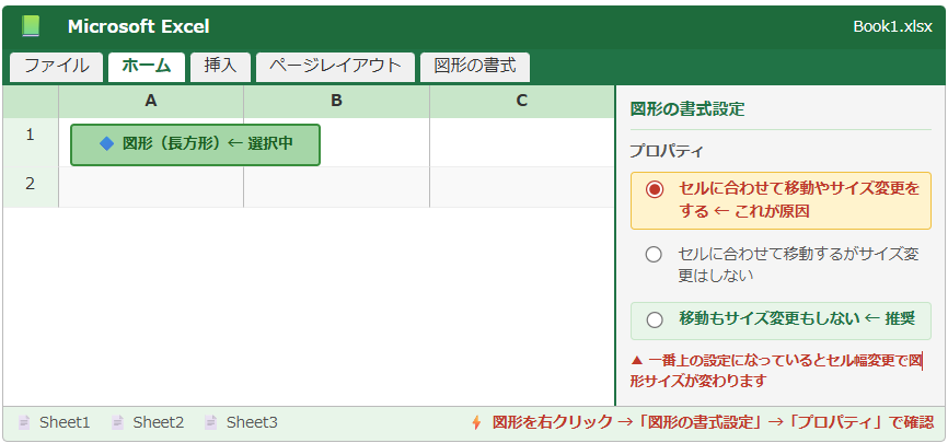 | 列幅変更で図形が縮む | セルに合わせてサイズ変更 | 図形の書式設定 → プロパティ変更 |