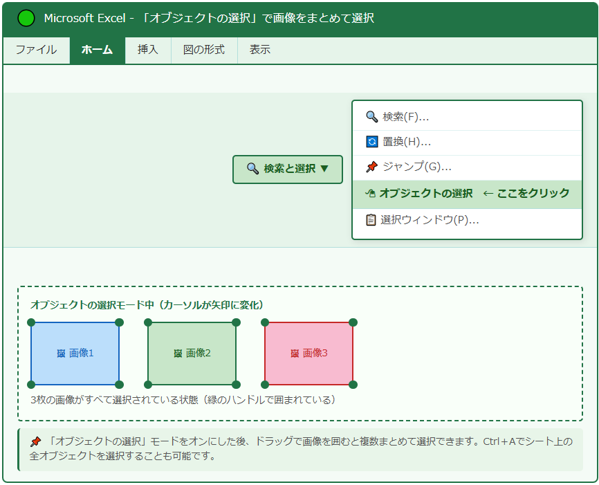 Excelで複数の画像をまとめて選択する最も確実な方法が、「ホーム」タブ→「検索と選択」→「オブジェクトの選択」を使う方法です。