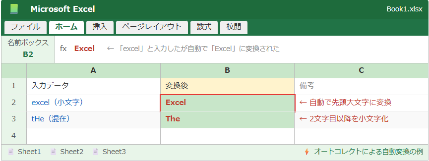以下のイメージ図は、エクセルで「excel」と小文字で入力した際にオートコレクトが働き「Excel」と先頭が大文字に変換されてしまう例を示しています。
