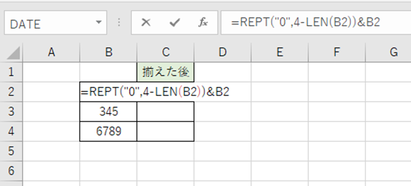 ・REPT(”0”,4-LEN(B2))で、4桁から指定した数字の桁数を引いた回数だけ”0”を表示