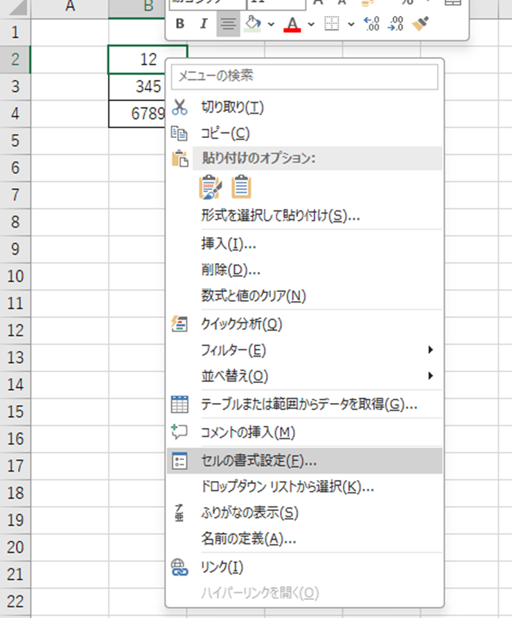B2セルを選択して右クリックをし、「セルの書式設定」をクリック。