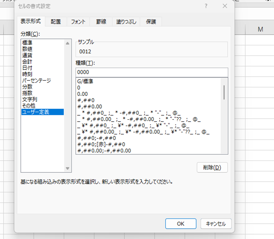 表示形式のタブにある分類の項目から「ユーザー定義」を選択。