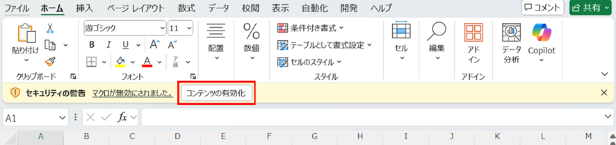 Excelはセキュリティ保護のため、デフォルトで全てのマクロを無効にしているため、手動で有効化する必要があるでしょう。